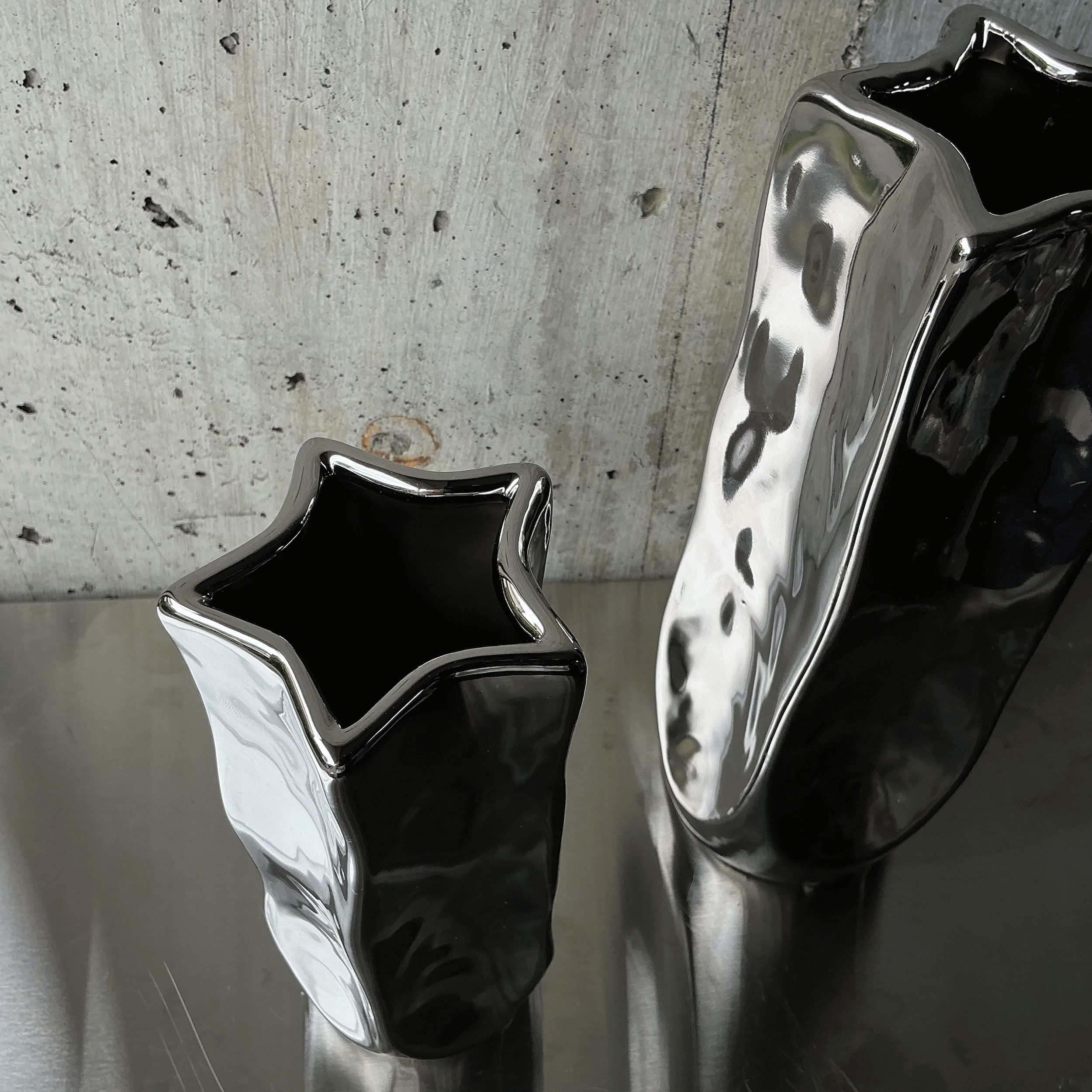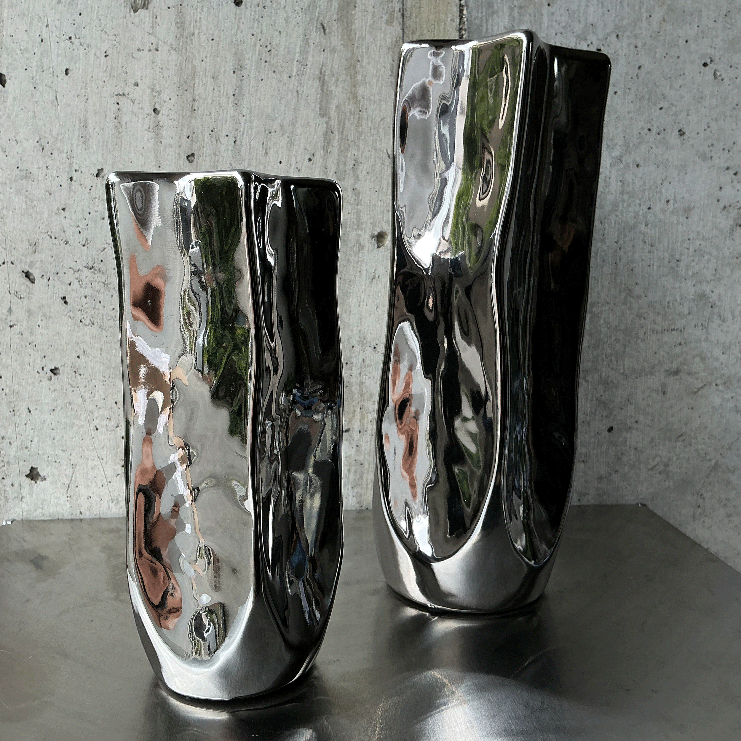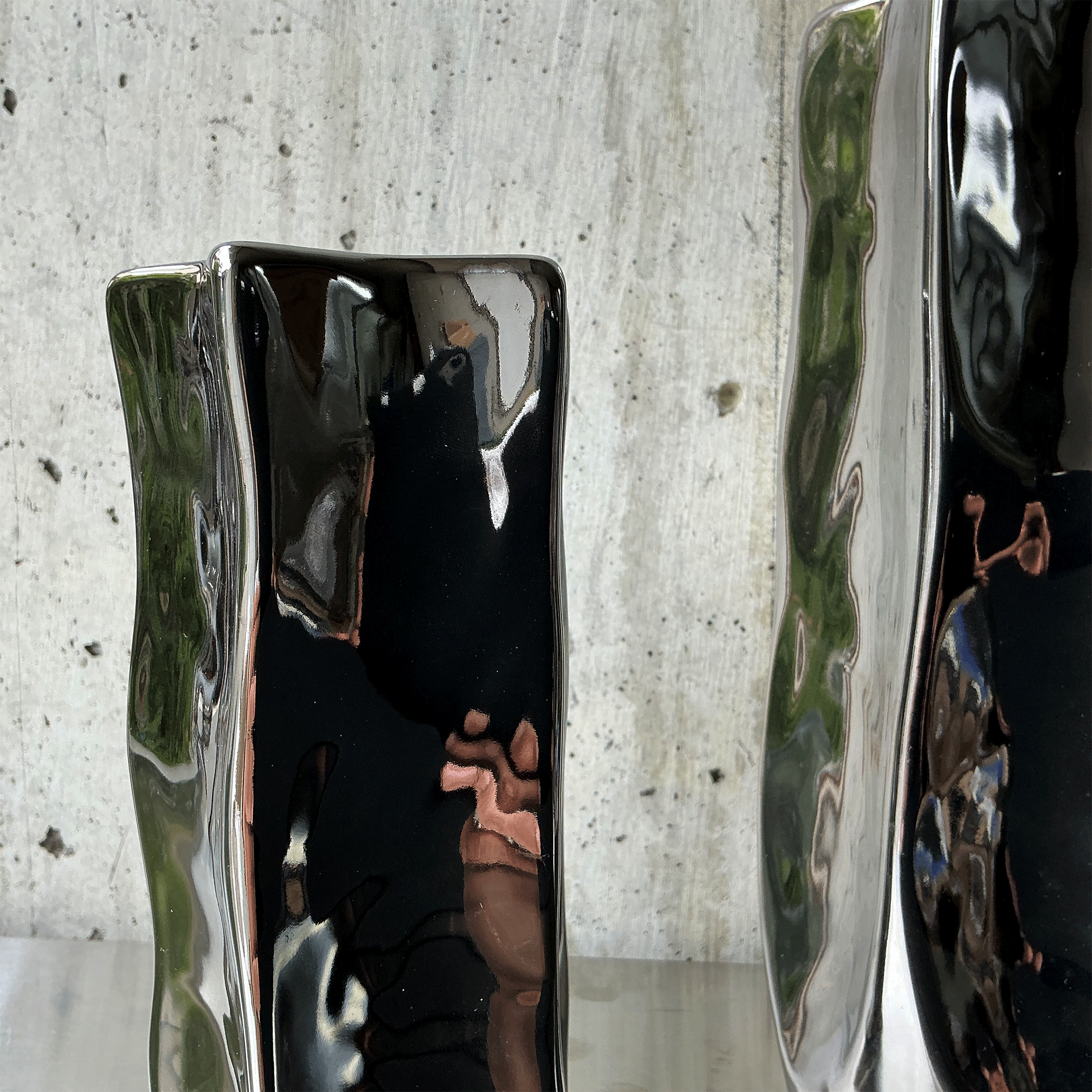 ゆらぎのあるフォルムは自然界の有機的な形を思わせ、メタリックな光沢は都市的な洗練を象徴している。