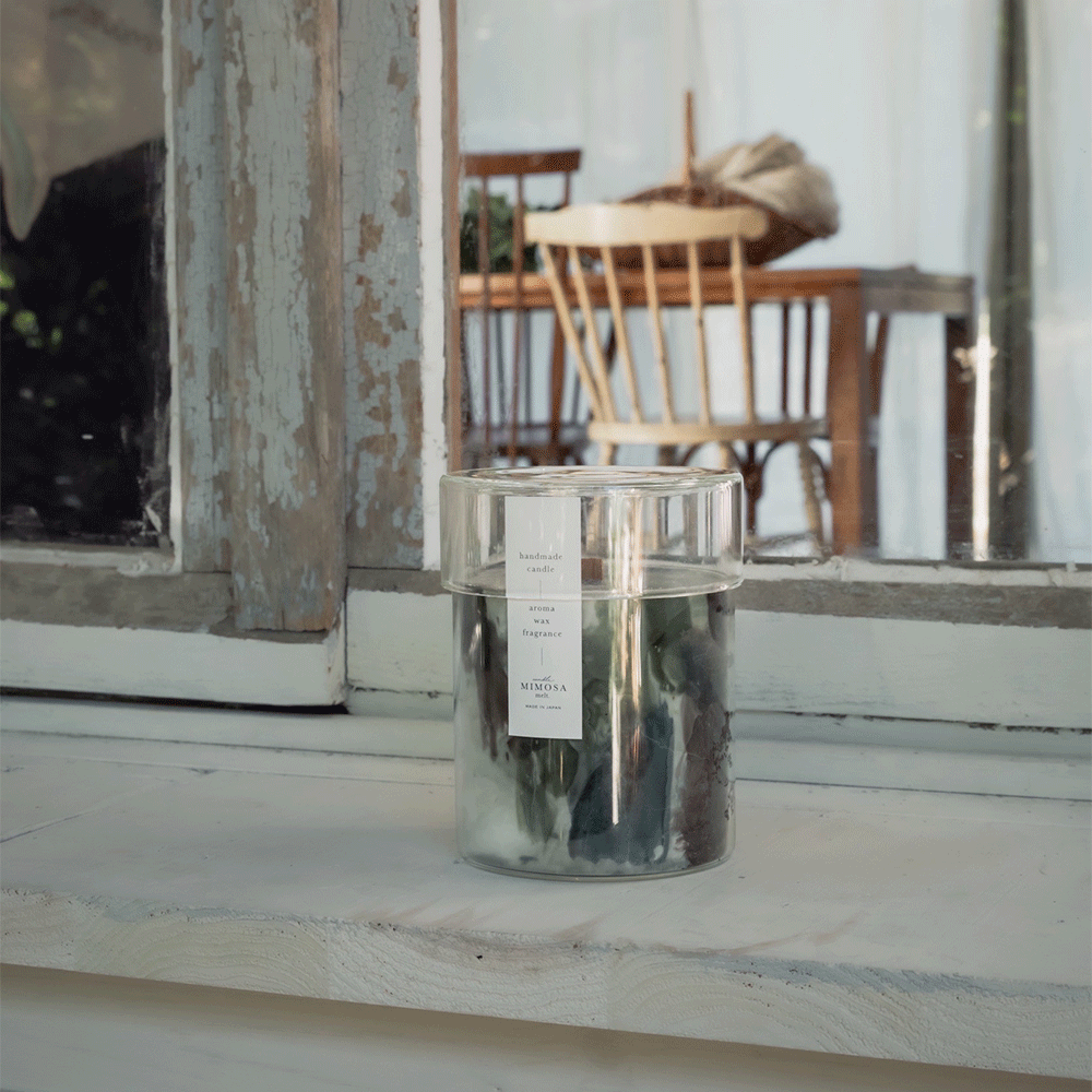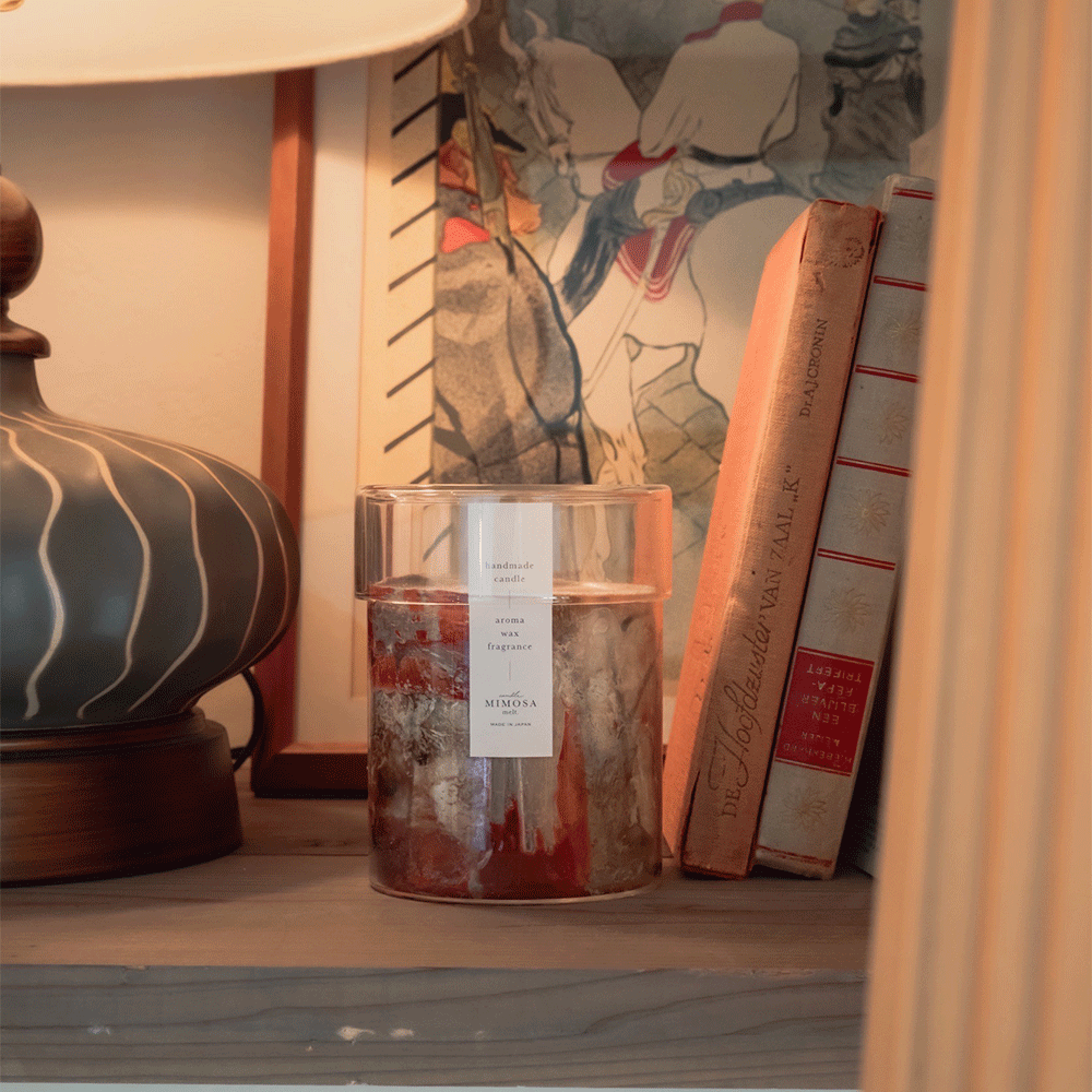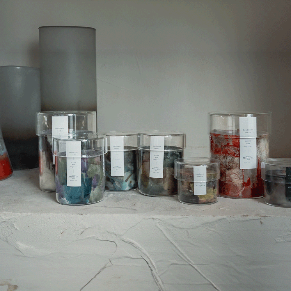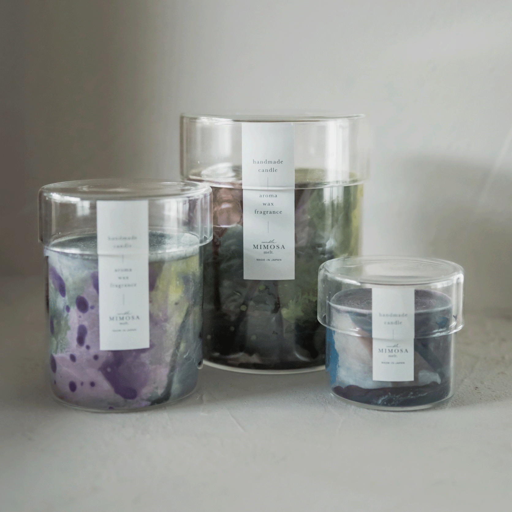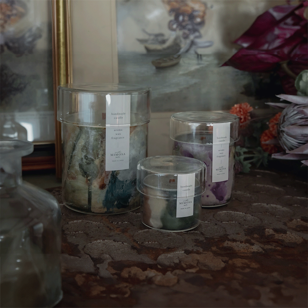 ガラスキャニスターの中に閉じ込めた彩りは、灯をともすたびに穏やかに溶け合い、空間に柔らかな光と香りを広げる。
