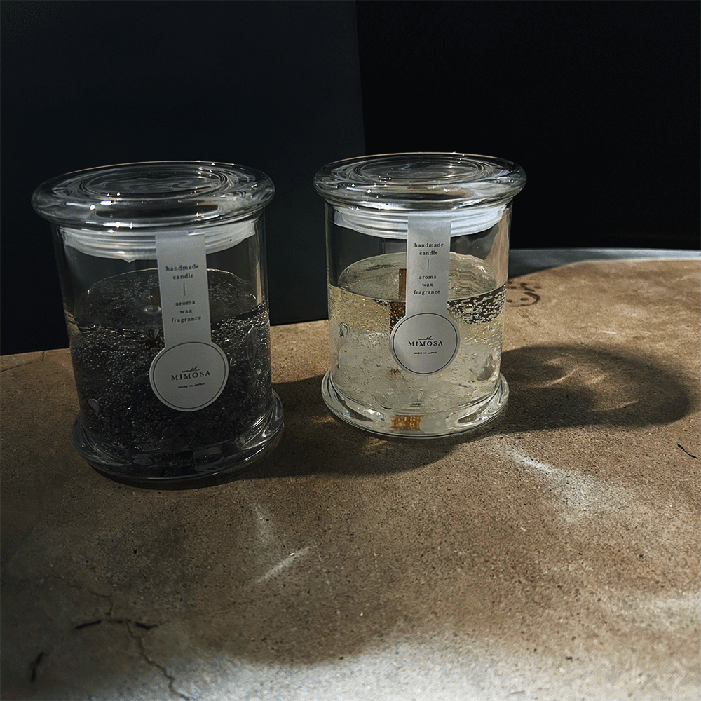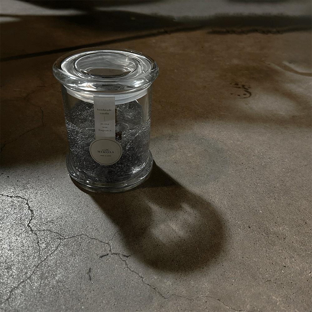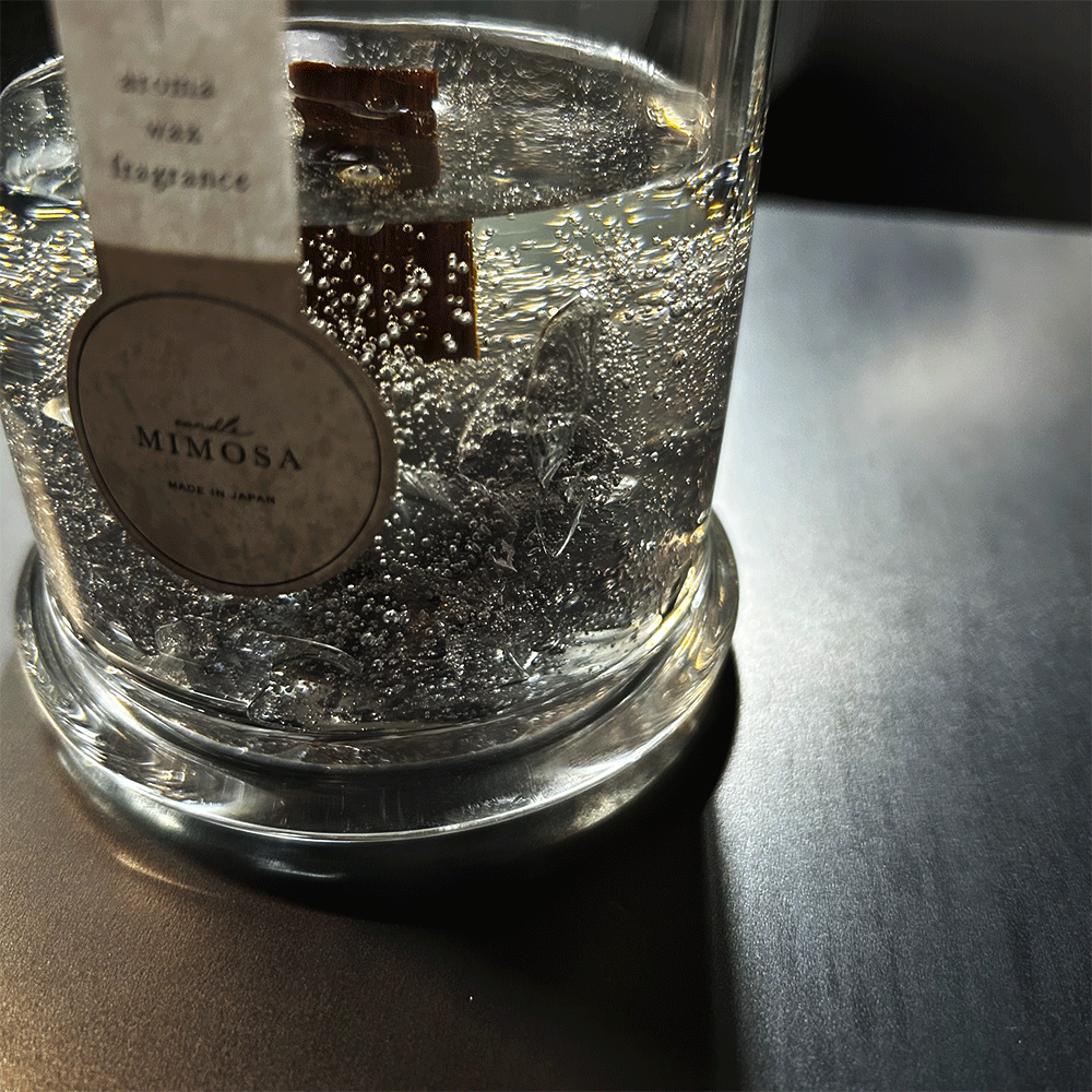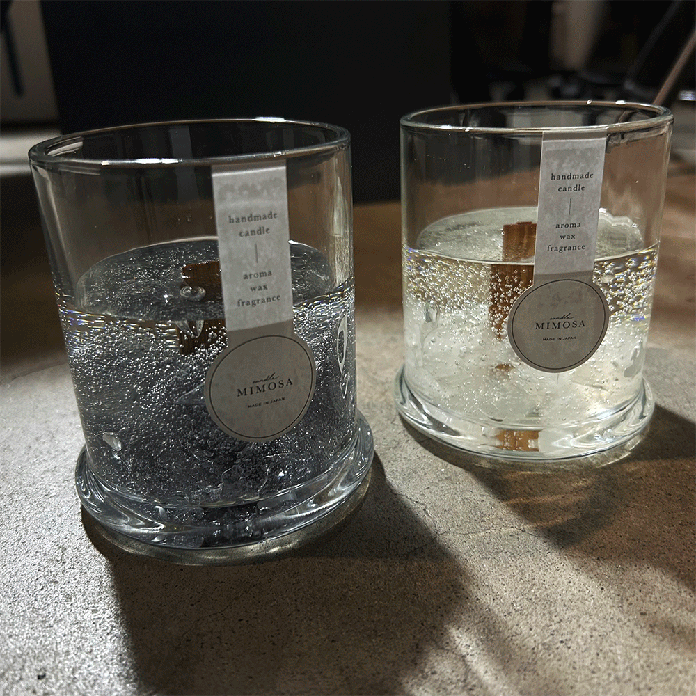 透明感あふれるガラスキャニスターの中で、特殊なジェルワックスが光を反射し、まるで水面で宝石が煌めいているかのような幻想的な美しさを演出。